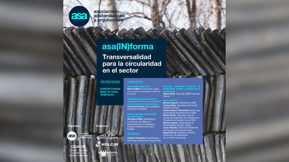 El 5 de febrero de 2026 el Grupo de Trabajo de Economía Circular y Transformación de asa organiza una jornada asa(IN)forma con el Colegio de Arquitectos de Castilla La Mancha (COACM).