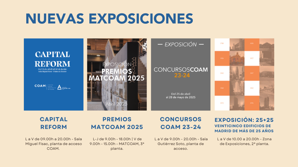 Por último, desde el 25 de abril al 28 de mayo, se celebra la exposición Concursos COAM, con las propuestas premiadas y mencionadas de las cinco convocatorias en las que el Colegio Oficial de Arquitectos de Madrid ha colaborado en su organización y gestión junto a diferentes organismos e instituciones entre 2023 y 2024.