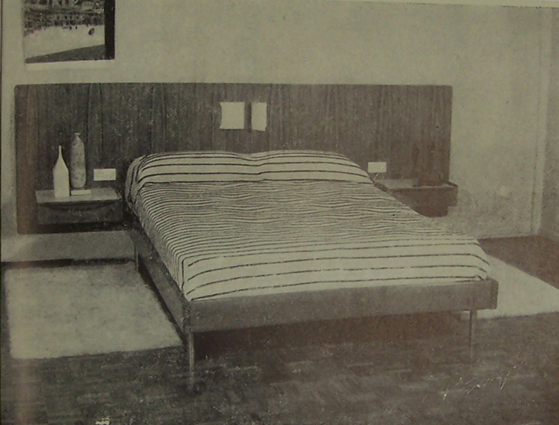 ---Cama bipersonal, con estructura de cama, cajones de mesitas de noche y cabecero de madera.