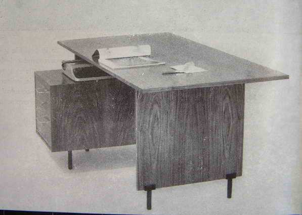 ---Mesa despacho, de madera con dos cajones y patas de metal.