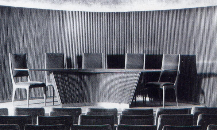 ---Estructura de madera. Recoge en sus formas de bumerán el gesto curvo y dinámico de la sala. Pieza única.