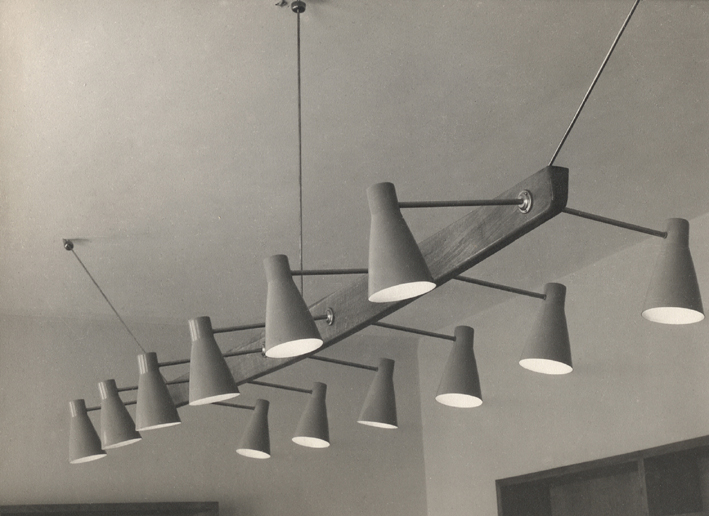 ---Luz cenital sobre una quilla de madera de nogal, suspendida con tubos de latón; las pantallas en verde claro.