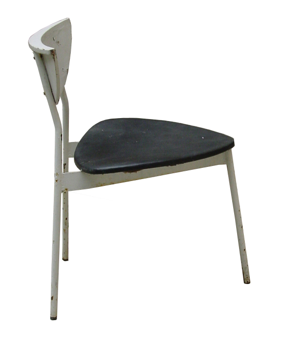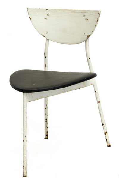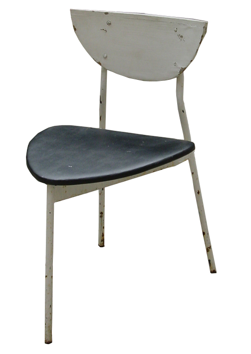 ---Estructura de metal con tres patas. Asiento tapizado y respaldo de madera.