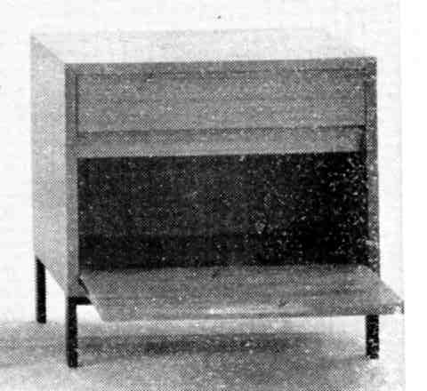 ---De madera y patas de metal, con un cajón y una puerta abatible.