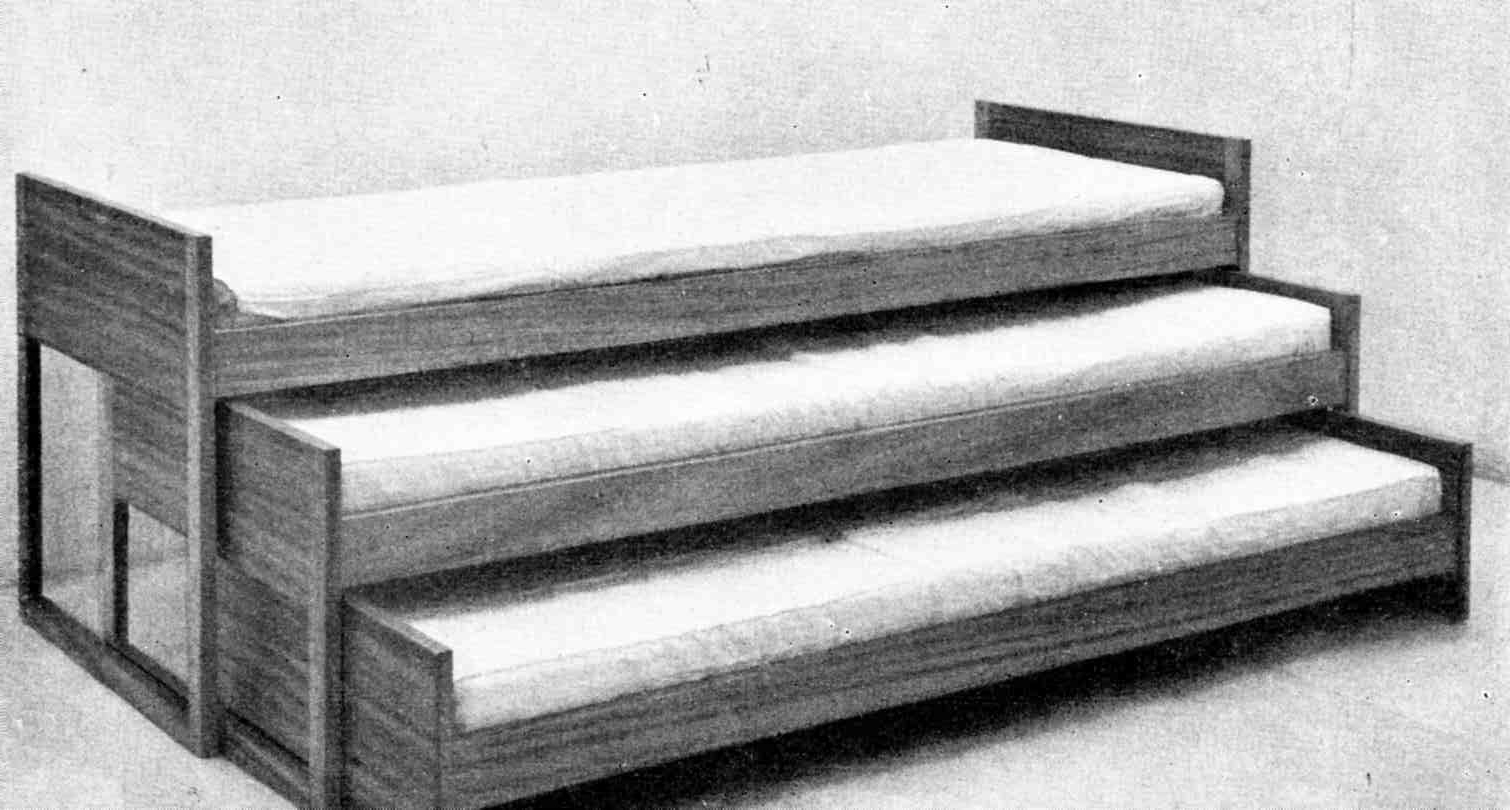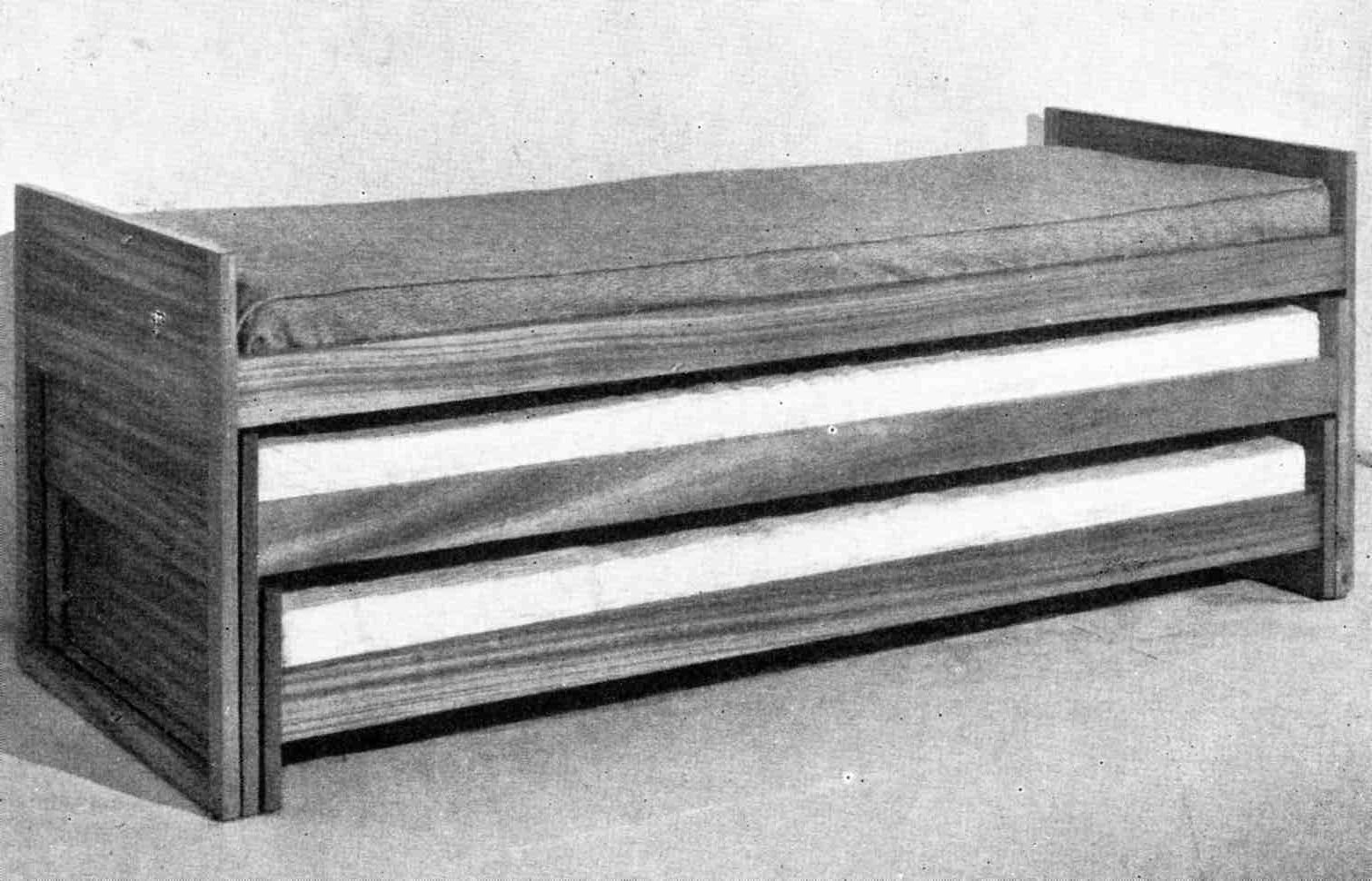 ---Tres camitas de niños que se superponen. Los cochones de gomaespuma se apoyan sobre tableros.