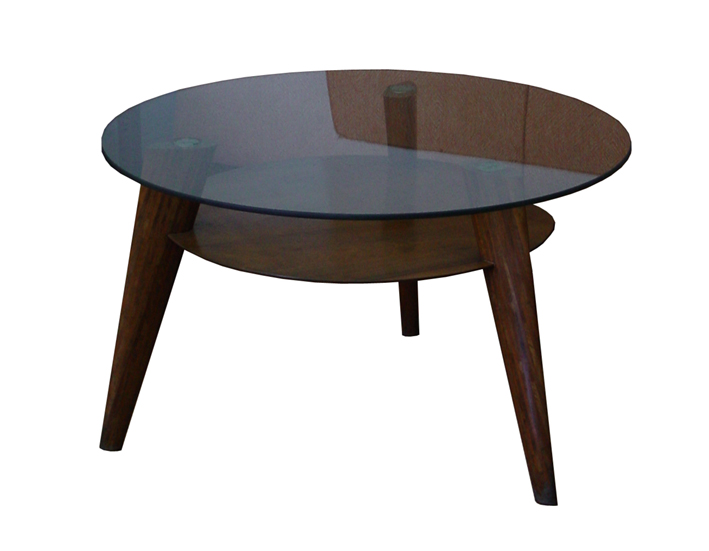 ---Con tres patas de madera, sobre circular de cristal con una balda de madera, mesa para el despacho del Director.