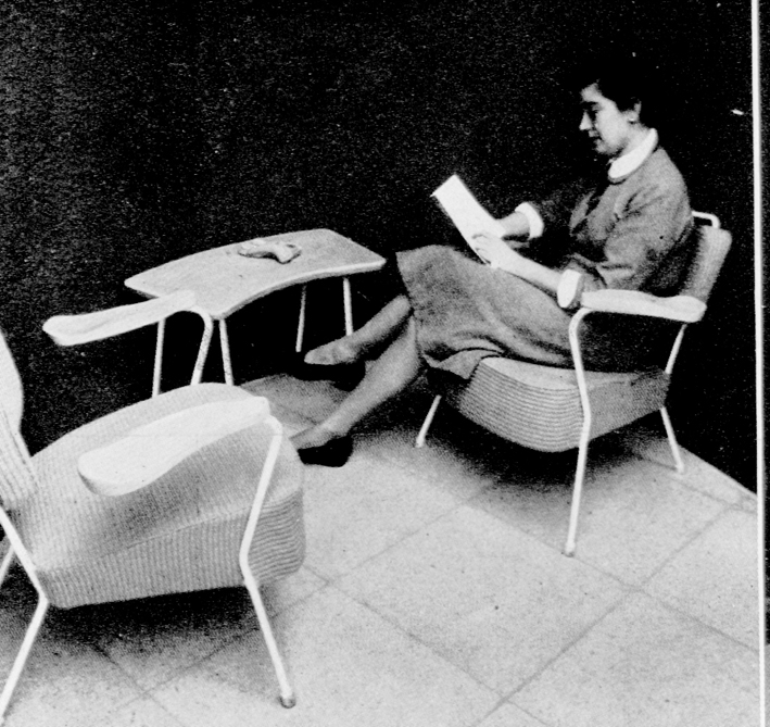 ---Sillón sobre estructura de acero, asiento y respaldo tapizados y brazos modelados. Mesa auxiliar de madera y patas de acero.