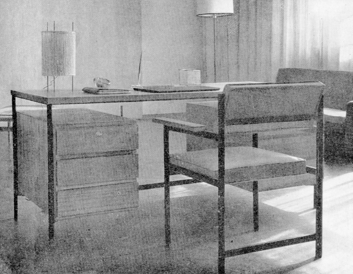 ---Mesa Modelo MO-160 estructura de tubo de acero; cuerpo de cajones desmontable y tapa en madera. Sillón: estructura de acero, asiento y respaldo de gomaespuma tapizado en piel natural; brazos de madera.