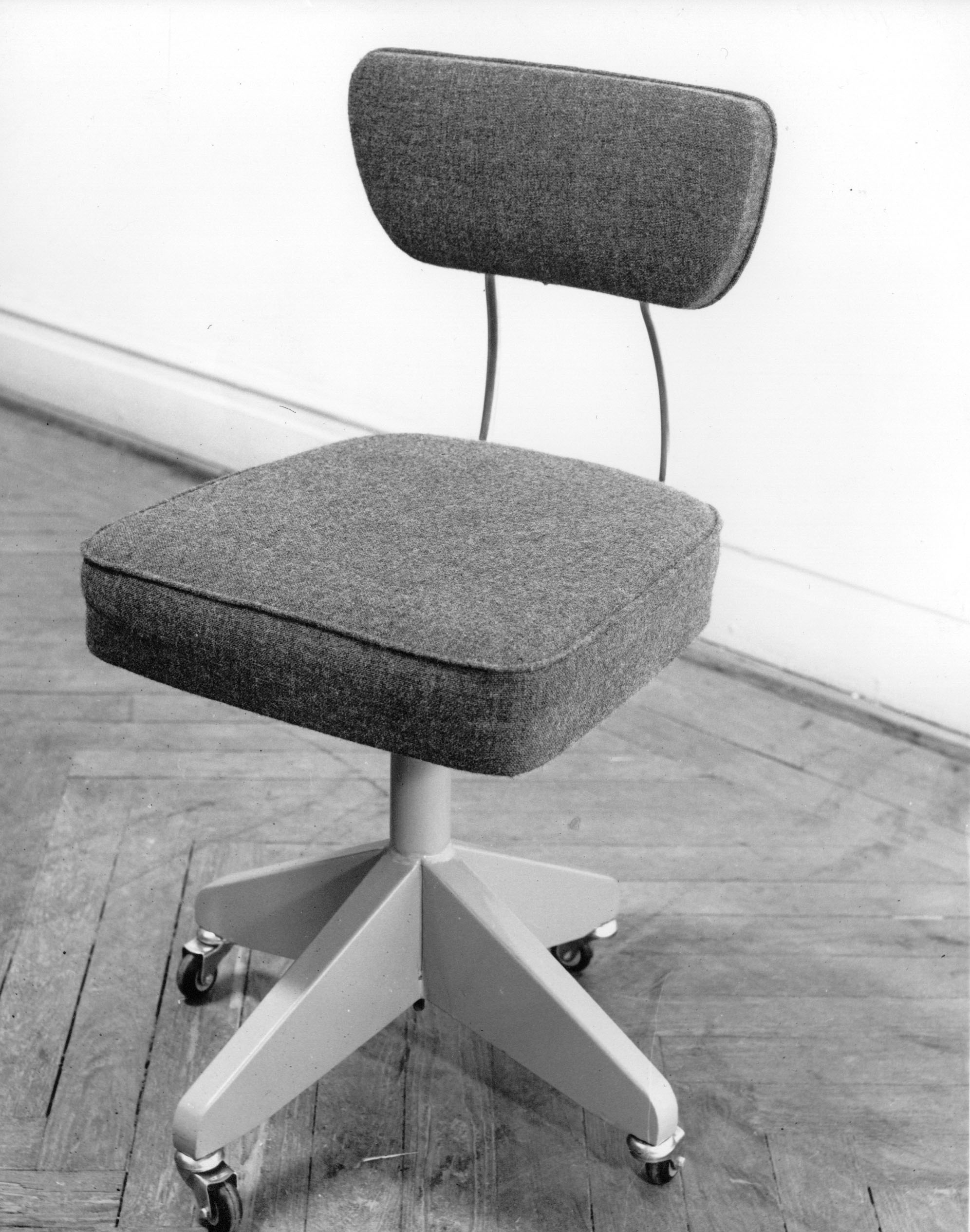 ---Silla giratoria con ruedas, asiento y respaldo de gomaespuma tapizados.