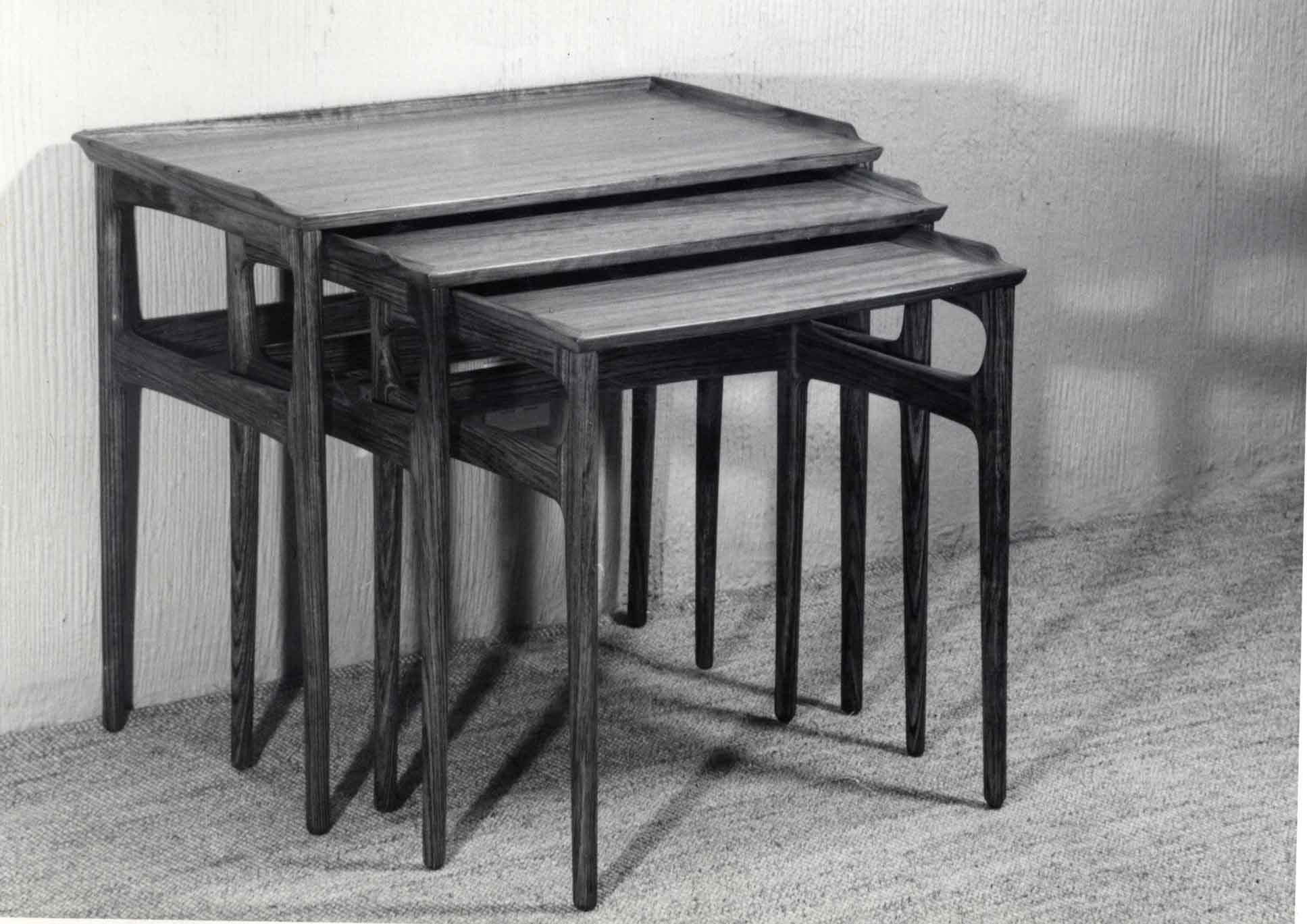 ---Conjunto de tres mesas de madera auxiliares.