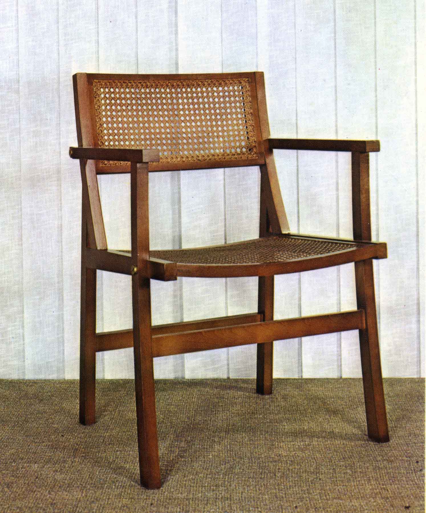 ---Estructura de madera con brazos, asiento y respaldo de rejillas.