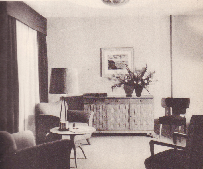 ---Habitación del hotel. Interior compuesto por un mueble-bar que ocupa el apartamento principal, una silla, tres butacas, una mesita y una lámpara.