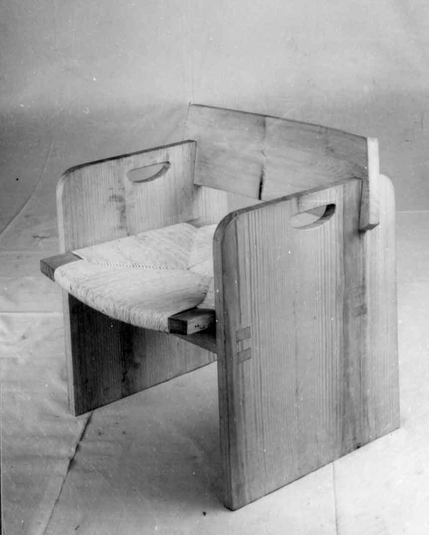 ---Brazos y patas tablero seguido de madera. Respaldo madera. Asiento enea.