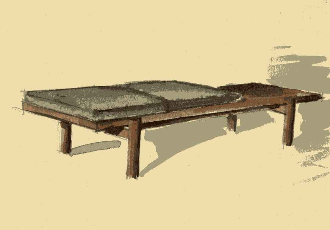 ---Banco de madera con patas torneadas, almohadones sueltos de goma.