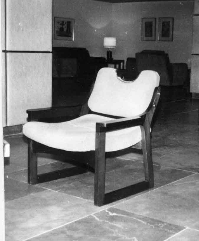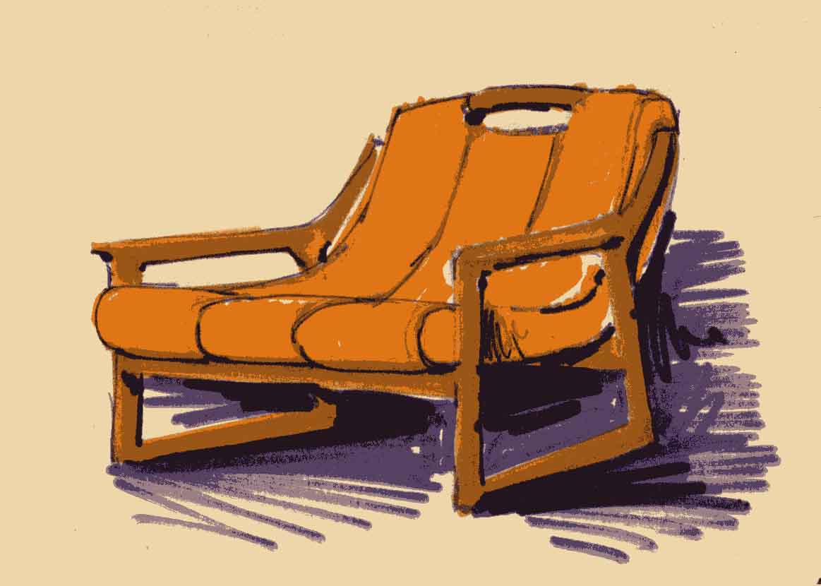 ---Brazos de madera, asiento y respaldo tapizado unidos en tres gajos con costuras profundas. Con asa en el respaldo tachueleada.