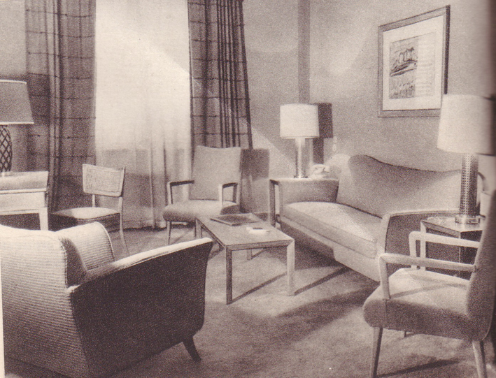 ---Habitación del Hotel. Interior compuesto por lámparas, silla, sillón, mesita y sofá.