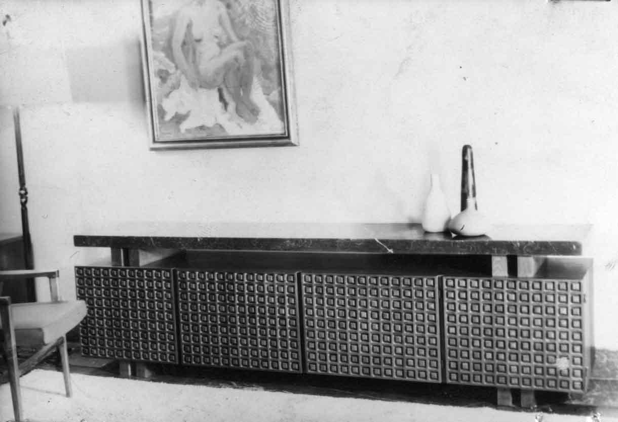 ---Con 4 puertas talladas de casetones pequeños. Tapa de marmol negro.