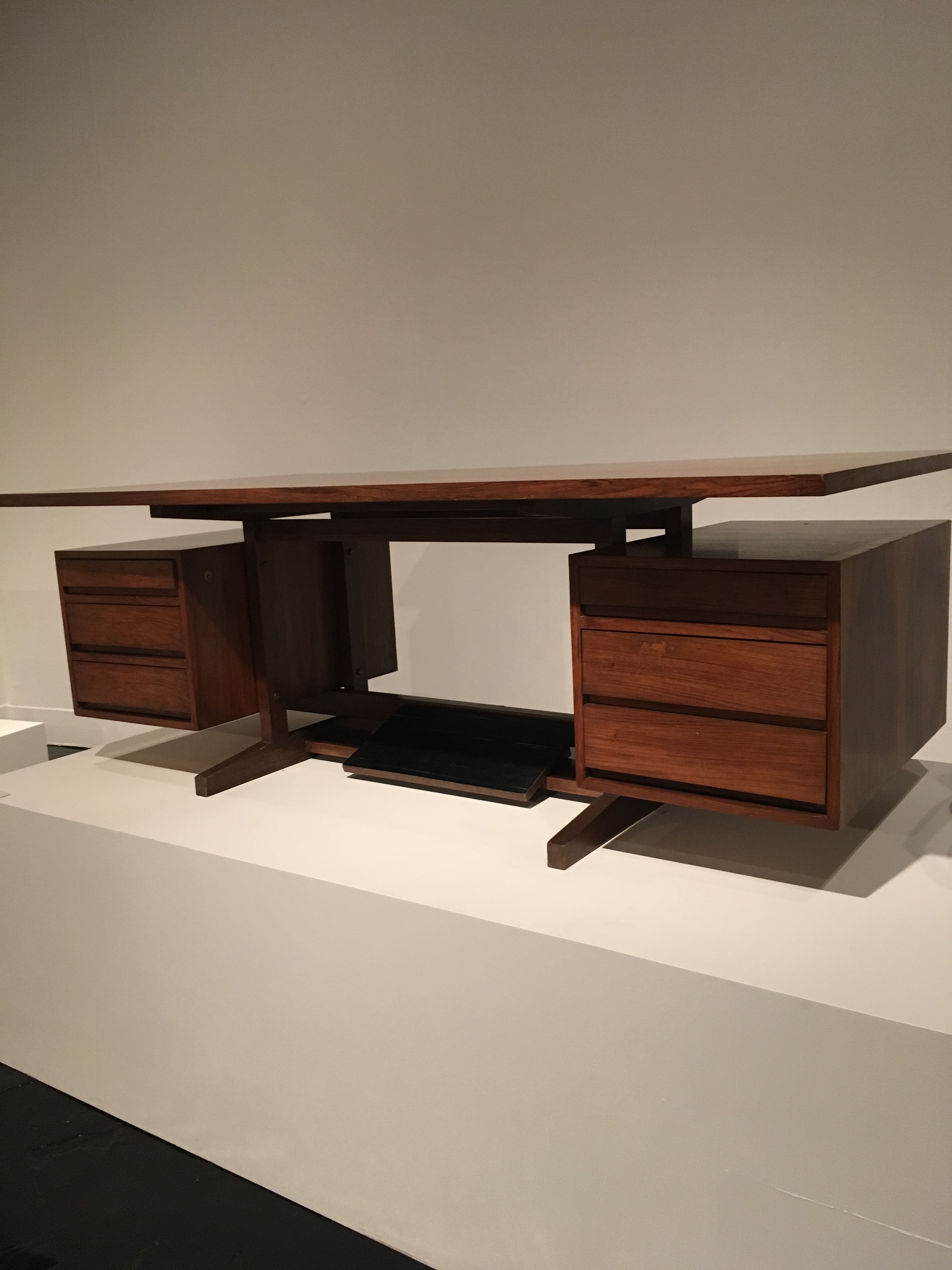 ---Escritorio de estructura de madera de nogal con tapa rectangular de embrero con dos cuerpor de cajones C3, uno a cada lado, y reposapié.