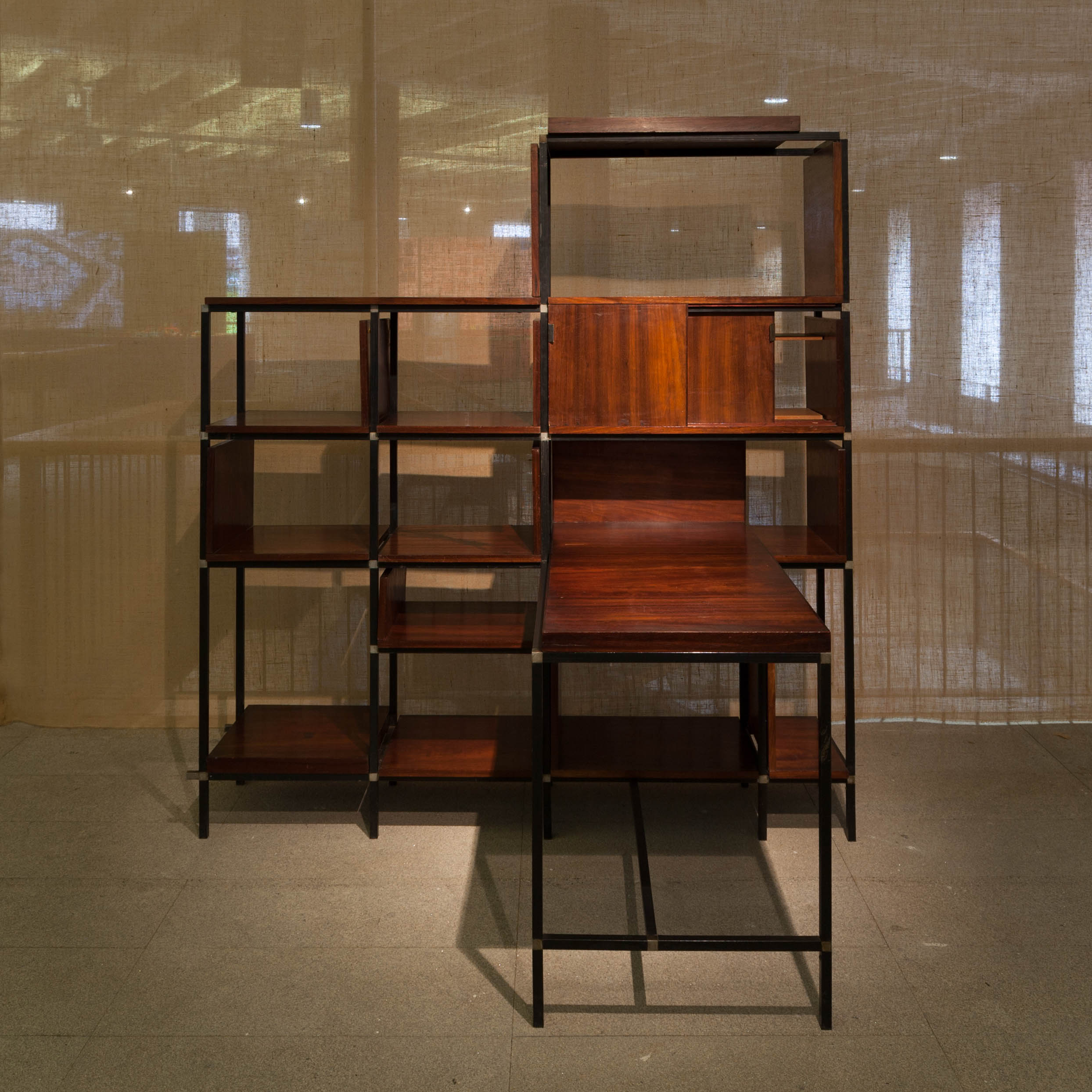 ---Estantería con mesa, estructura de tubo cuadrado de acero, aluminio y madera.