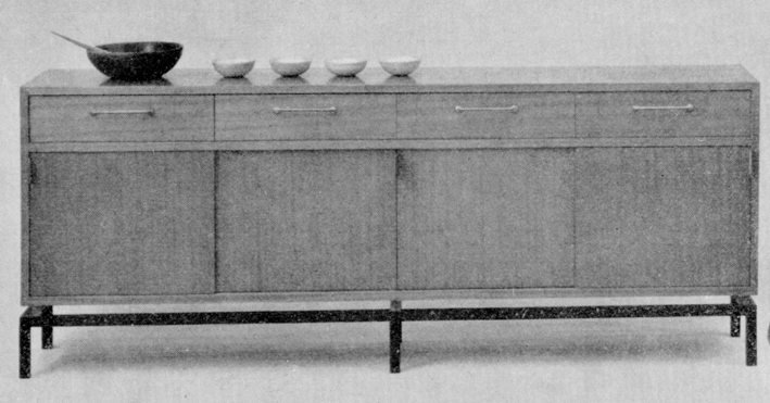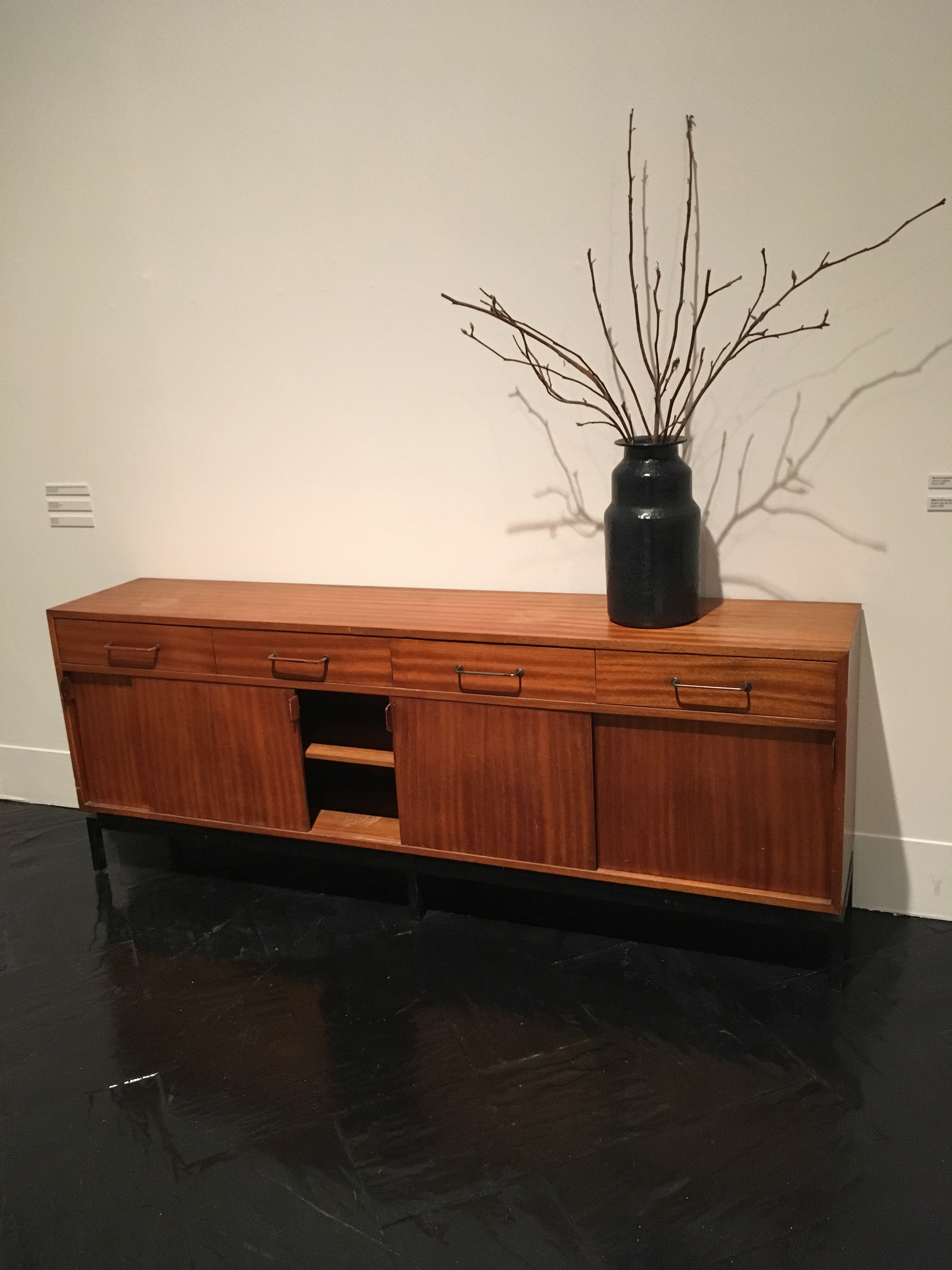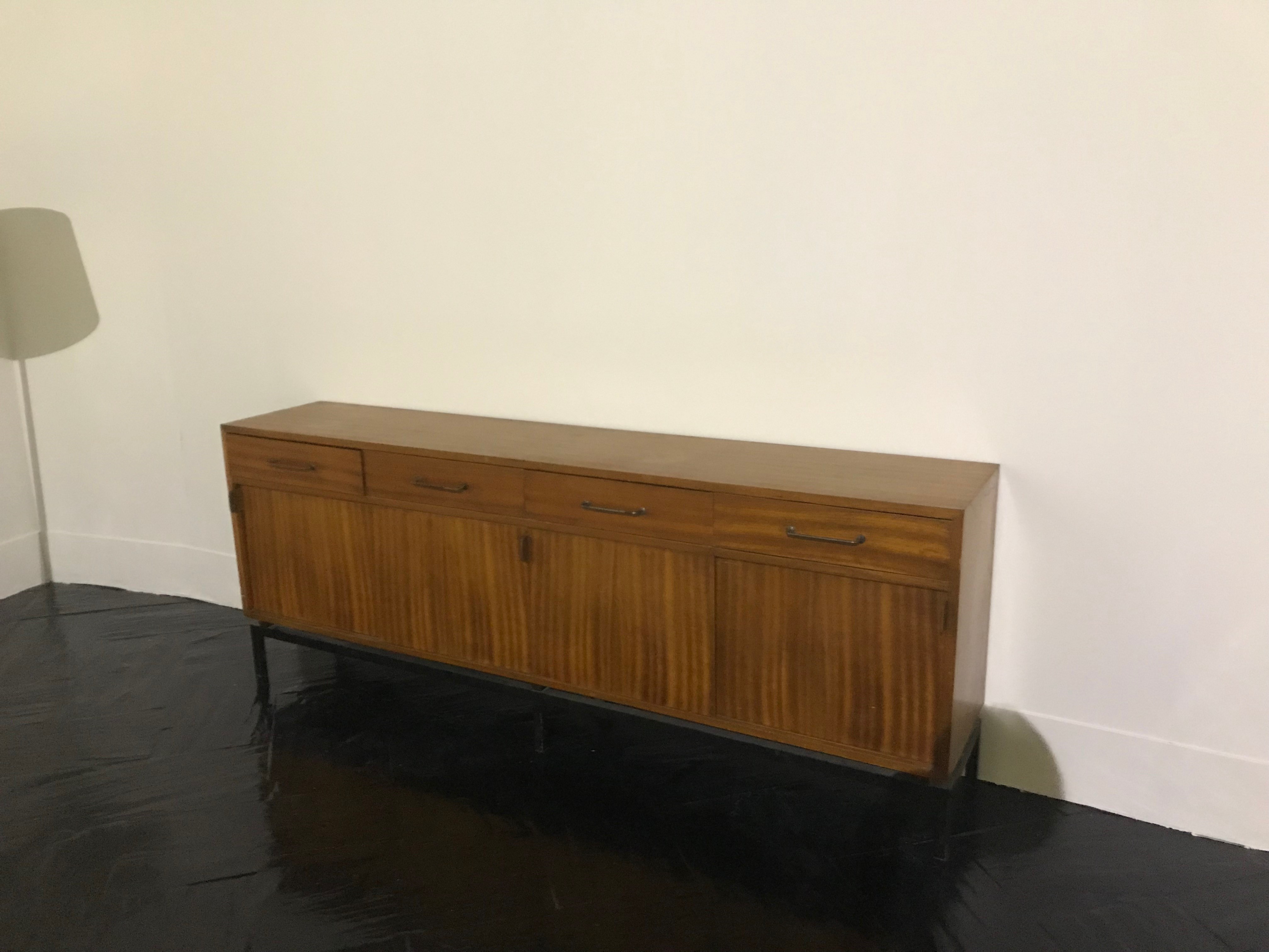 ---De madera de embero con puertas correderas y cajones, sobre una estructura de acero. Tiradores de piel.