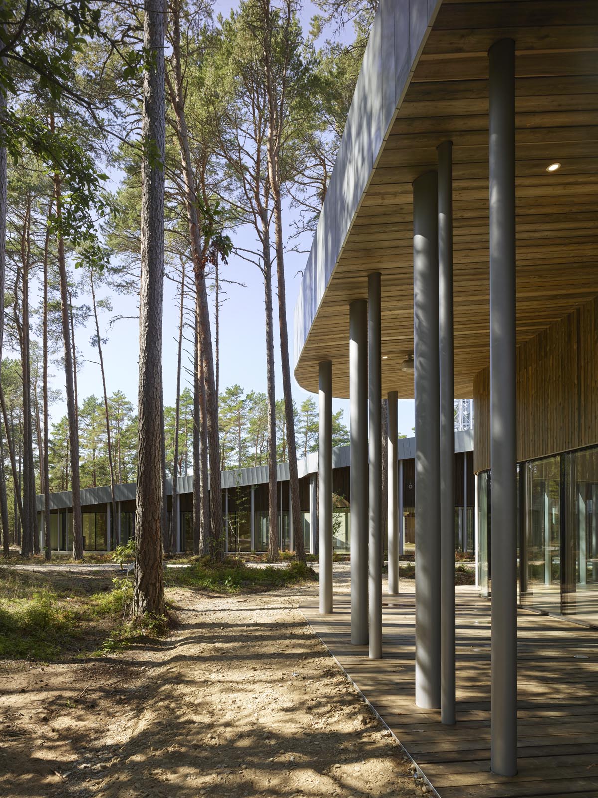 Situado en un bosque de grandes pinos junto al mar Báltico, el proyecto de Nieto Sobejano sugiere un diálogo entre la arquitectura, la música y el paisaje. Originado en un patrón geométrico de patios pentagonales, el edificio busca un equilibrio entre la intimidad de la obra de Arvo Pärt y la serena belleza del magnífico entorno natural. Una gran cubierta de zinc unifica el conjunto y se integra en el bosque albergando espacios de archivo, biblioteca, administración, exposiciones y sala de conciertos. El perímetro exterior es tratado como un filtro de delgadas columnas circulares que se funde con los pinos circundantes. Una esbelta torre helicoidal de base pentagonal se eleva por encima de los árboles para permitir desde la altura las vistas hacia el mar.
